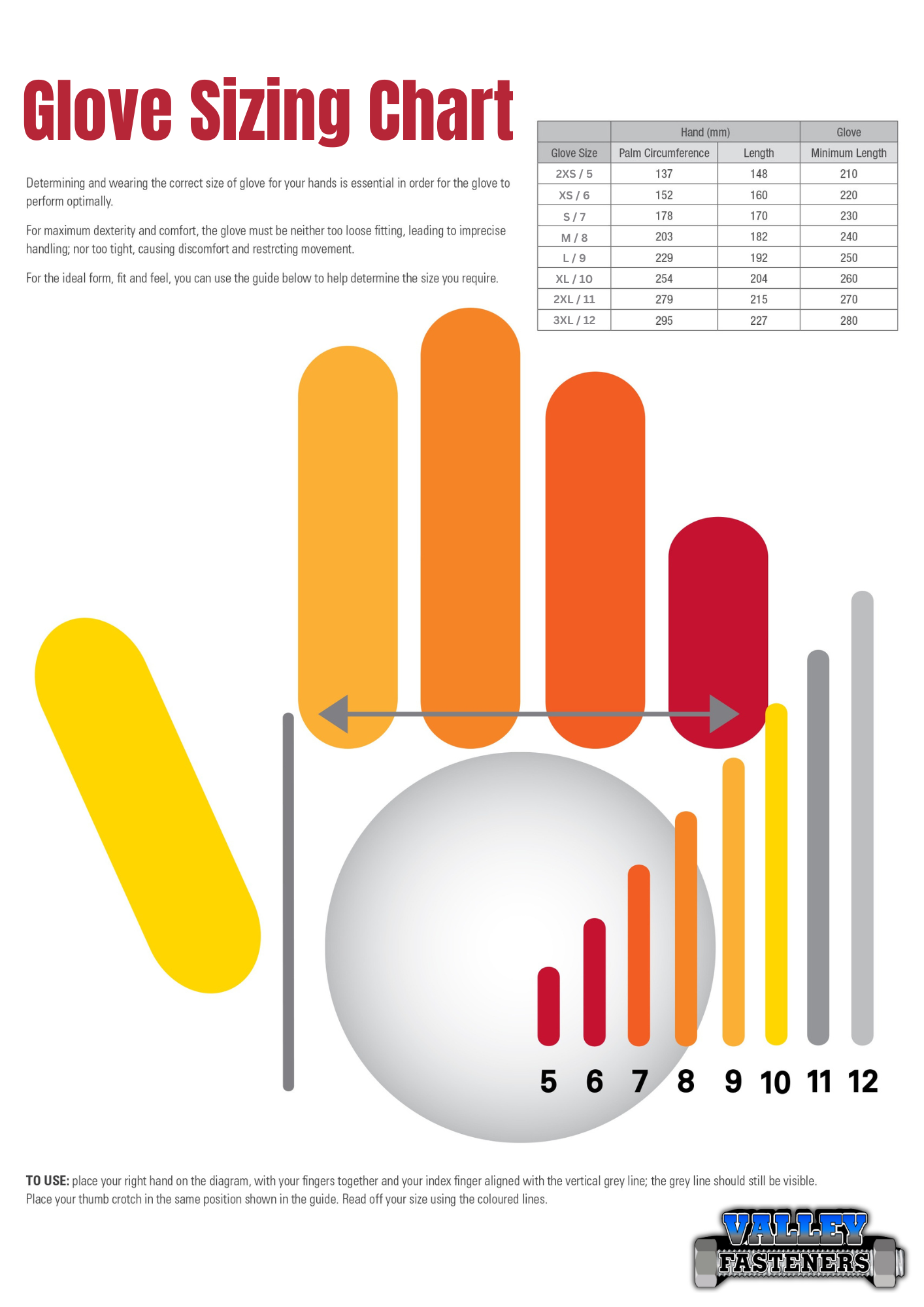 Click on the LINK and print off an A4 chart to identify the correct glove size Valley Fasteners Glove Chart