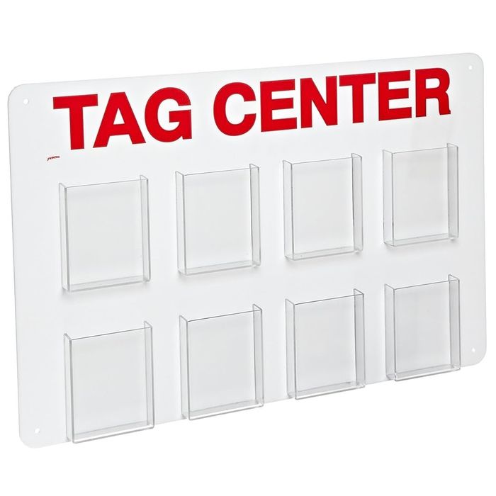 DESCRIPTION: Tag Centre - 8 Pockets Acrylic, Polystyrene H400 x W597 x D51 mm White/Red FEATURES: Store your most commonly used tags in easy-to-find locations using our 8-Pocket Tag Safety Station.