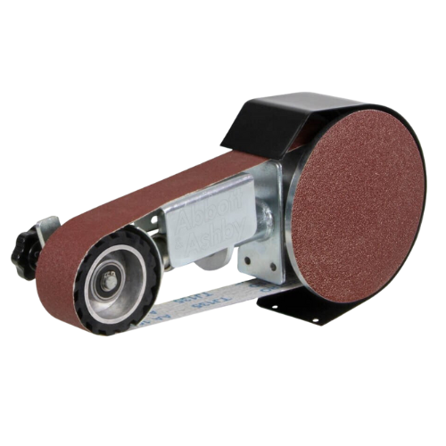 Description: Easy left or right-hand side installation on most 150mm (6”) and 200mm (8”) grinders, Patent pending design allows for fast changes to the working angle without disassembly in 6° increments, Top platen can be used for flat surface grinding and can be moved out of the way for convenient free strapping, Easy belt tracking adjustment knob and lock, Fast belt changes with patent pending self-locking push in push out arm. Specs: 915 x 50mm (36 x 2”) belt – 240 Grit, 178mm (7”) diameter disc – 120 Grit, 89mm (3.1/2”) contact wheel.