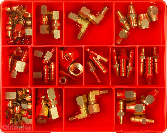 Description: 22 Types: Compression Olives and Nuts, Male Single and Double Union, Male Elbow 90°, Flare Nuts and Unions, Male Barbs and Nuts & Tails. 3 Sizes: 3/16?, 1/4? and 5/16?, 110 Pieces