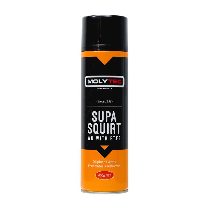 DESCRIPTION: Aerosol Workshop - Supa Squirt 400g Aerosol - Powerful Water Dispersing Fluid FEATURES: Supa Squirt is a powerful water dispersing, lubricating and penetrating fluid containing P.T.F.E. Protects machinery, toys, guns, fishing tackle etc. Disperses water, lubricates and loosens nuts, bolts and more.