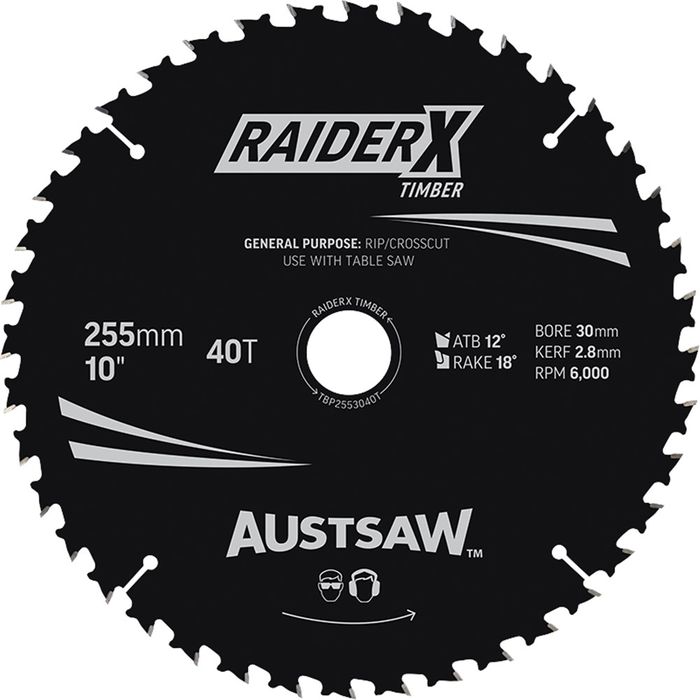 DESCRIPTION: Austsaw RaiderX Timber Blade 255mm x 30 Bore x 25.4mm Bush 40 T Table Saw