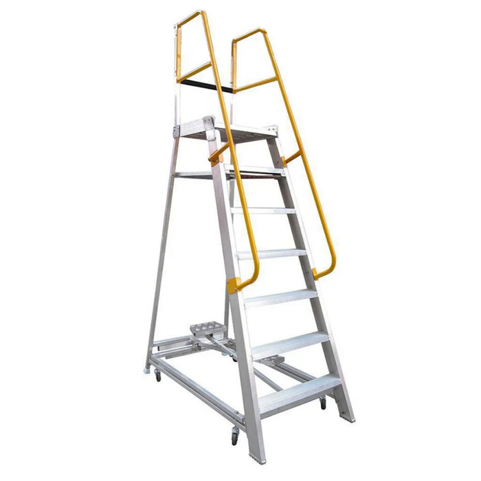Features: Large platform surface: 600mm (wide) x 585mm (deep), Patented raise/lower mechanism provides effortless and reliable activation, Specifications: Material: Aluminium - 200kg Industrial, Height to Platform: 2.1m, Weight: 46.2kg
