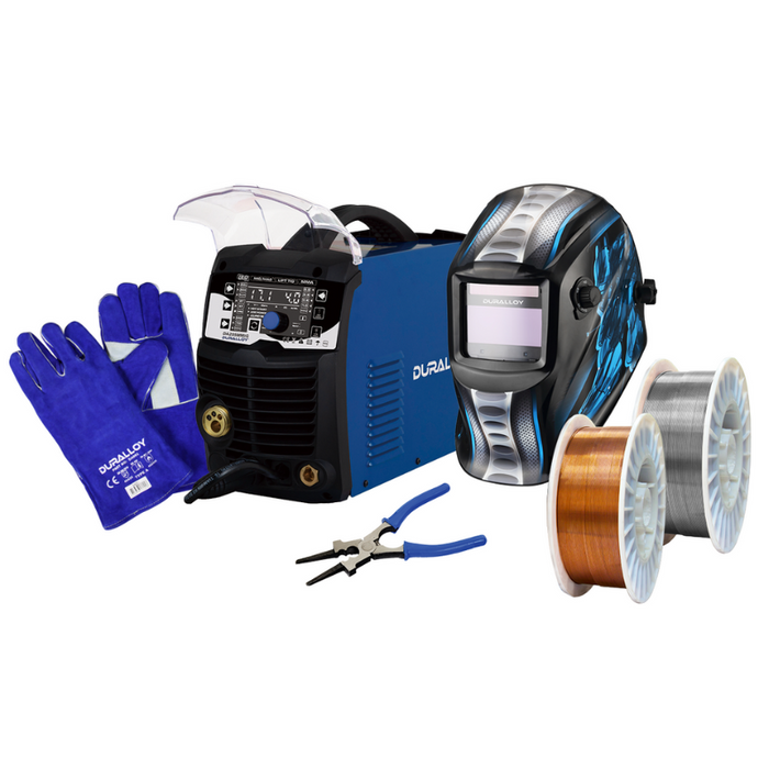 DESCRIPTION: DA205MMIGB Duralloy Multimig 171 240V 10A Inverter Package Bundle| Duralloy Mig Welding Machines & Multi Process Machines BUNDLE | Bundle includes *1 x DA650B Duralloy Welding Helmet - 1 x pair DA001 Duralloy Welding Gloves - 1 x DAM11095 Duralloy 0.9mm Gasless mig wire 5kg - 1x DA09P5 Duralloy 0.9mm 70s6 mig wire 5kg - 1x DAYS50 Duralloy 8 way mig pilers (NOTE: Items in bundle subject to change based on suppliers 'bundle' offer at time of purchase)