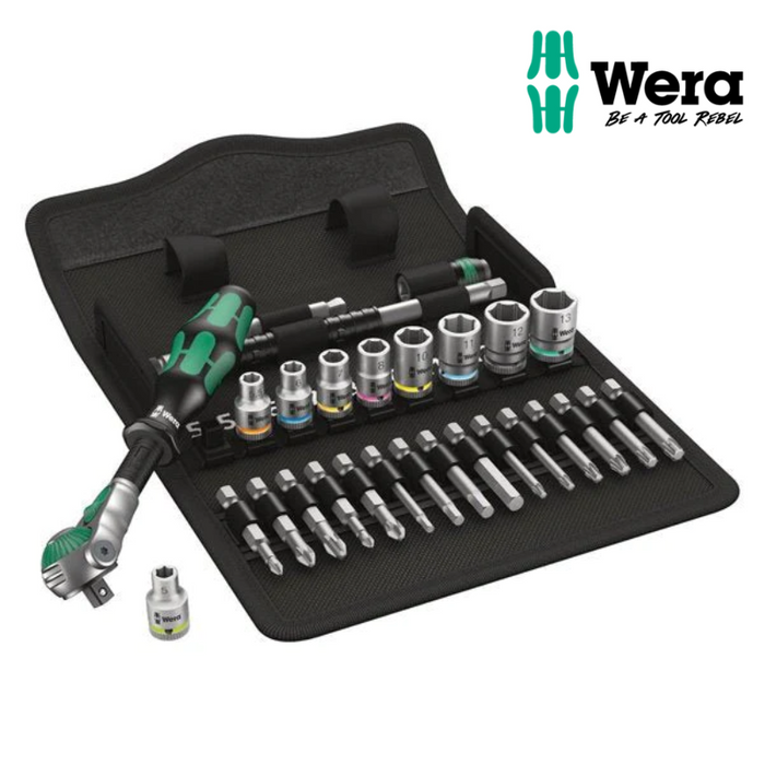 Description: A 28 piece Zyklop socket and ratchet set from Wera.This kit set the highest standards in quality and delivers in performance. The socket set has been well thought out offering the most popular sizes sockets, a selection of bits and extensions plus the added bonus of a ratchet with multiple positions.