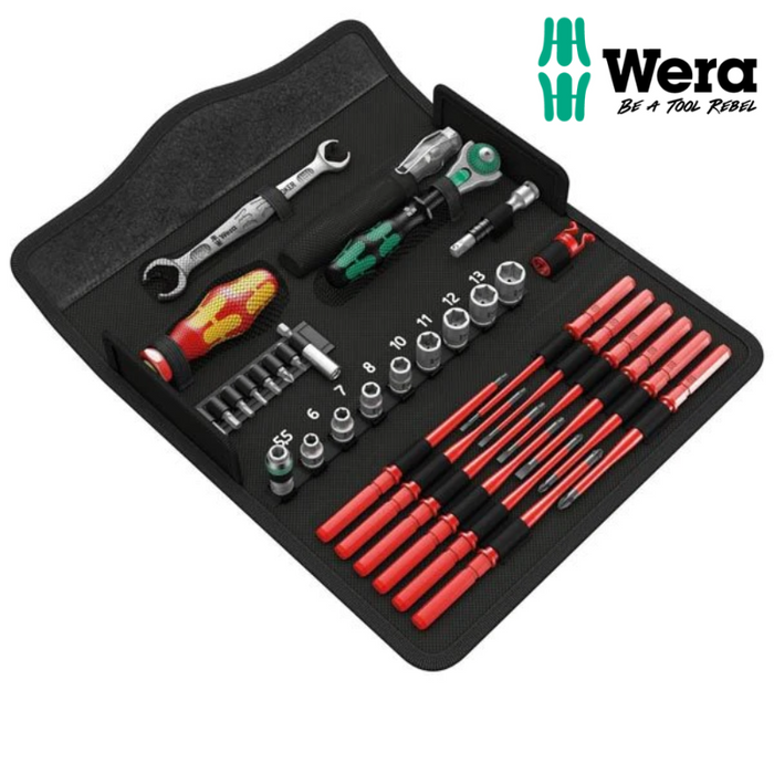 Description: Compact tool set with the 35 most important screwdriving tools for maintenance work both indoors as well as outdoors. Includes VDE holder with 12 VDE blades; 1 Joker double open-end wrench with holding function, limit stop, small return angle and extremely gripping teeth; the incredibly fast ΒΌ" Zyklop Speed ratchet and accessories; 8 manual and power tool sockets, sizes 5.5-13, 1 universal bit holder; 7 bits in a length of 25 mm; 1 screw gripper for firmly holding screws; 1 single-pole phase tester 247; textile box, very robust and durable; can be positioned upright in the workshop shelf for convenient storage; additional surface protection thanks to the textile outer material; low weight and volume for simplified mobility.