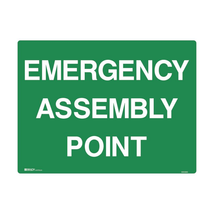 DESCRIPTION: Emergency Information Sign - Emergency Assembly Point (Polypropylene) H450mm x W600mm White/Green