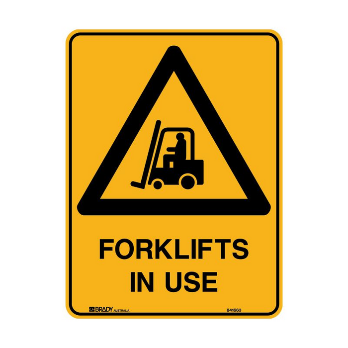 DESCRIPTION: Warning Sign - Forklifts In Use, 300mm (W) x 450mm (H), Polypropylene Yellow/Black