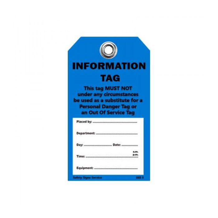 DESCRIPTION: Information Tag, 75mm (W) x 125mm (H), Pack of 100 Blue/Black | Information tag used to provide details of the marked machinery/equipment, allows user to provide specific information such as date, time and more. FEATURES: Tags made from heavy duty tearproof and weather resistant material | Measures 75mm (W) x 125mm (H) with a 8mm (DIA) brass eyelet | Blue in colour for clear distinction | Comes in a pack of 100 tags
