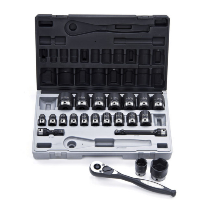 Description: 22 Piece 1/2 Drive 6-Point, Imperial, Standard Socket Set, 3/8-1-1/2" Sockets, 24 Tooth Ratchet Handle with Quick Change Chuck. 75 & 150mm Extension Bar, Blow-mold Case.