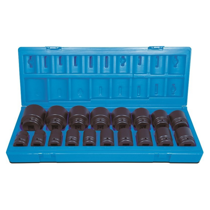 Description: 18 Pieces 3/4 Drive 6-Point, Metric Standard, 19, 21, 22, 24, 26, 27, 28, 30, 32, 33, 35, 36, 38, 40, 41, 42, 46, 50, Blow-mold Case.