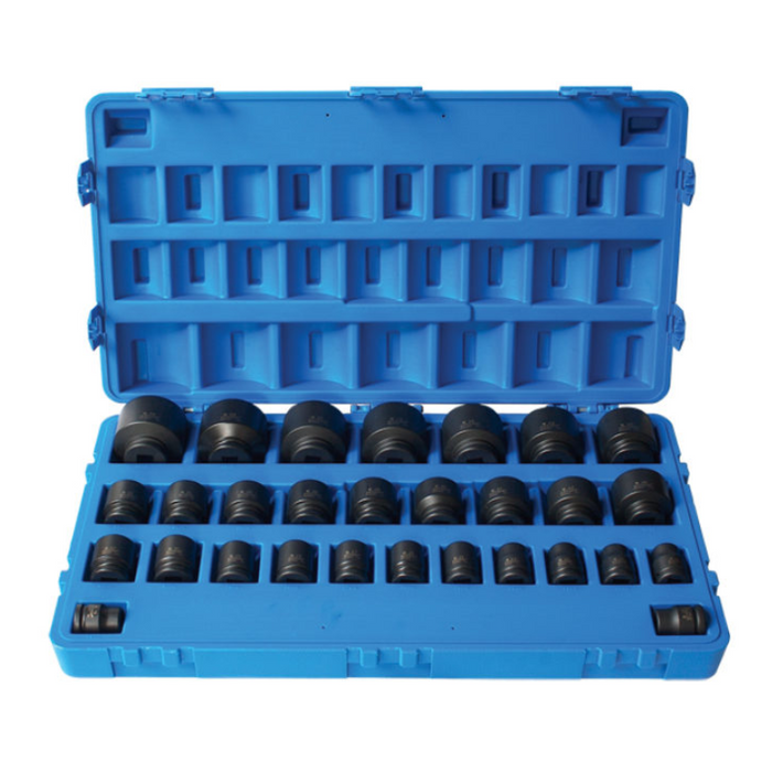Description: 29 Pieces 3/4 Drive 6-Point, Metric Standard, 19, 20, 21, 22, 23, 24, 25, 26, 27, 28, 29, 30, 32, 33, 34, 35, 36, 38, 40, 41, 42, 46, 50, 52, 55, 58, 60, 63, 65, Blow-mold Case.