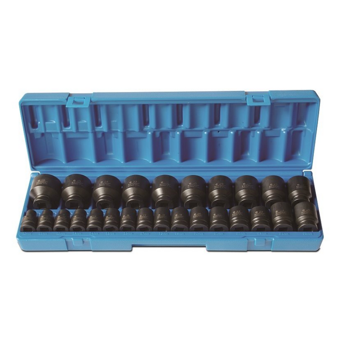 Description: 26 Pieces 1/2 Drive 6-Point, Metric Standard, 10, 11, 12, 13, 14, 15, 16, 17, 18, 19, 20, 21, 22, 23, 24, 25, 26, 27, 28, 29, 30, 32, 33, 34, 35, 36, Blow-mold Case.