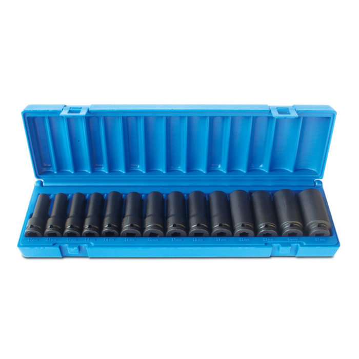 Description: 14 Pieces 1/2 Drive 6-Point, Metric Deep, 10, 11, 12, 13, 14, 15, 16, 17, 18, 19, 21, 22, 24, 27, Blow-mold Case.