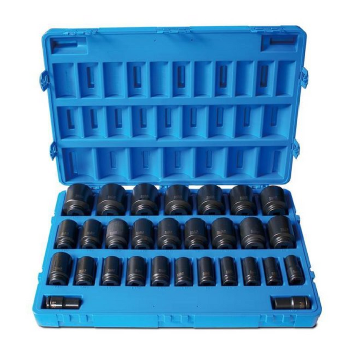 Description: 29 Pieces 3/4 Drive 6-Point, Metric Deep, 19, 20, 21, 22, 23, 24, 25, 26, 27, 28, 29, 30, 32, 33, 34, 35, 36, 38, 40, 41, 42, 46, 50, 52, 55, 58, 60, 63, 65, Blow-mold Case.