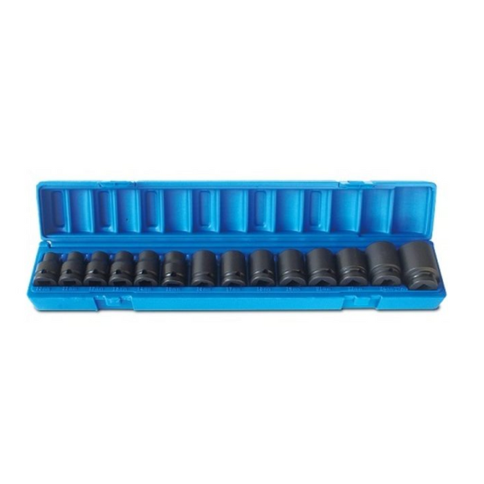 Description: 14 Pieces 1/2 Drive 6-Point, Metric Standard, 10, 11, 12, 13, 14, 15, 16, 17, 18, 19, 21, 22, 24, 27, Blow-mold Case.