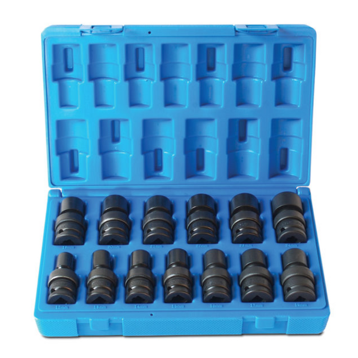 Description: 13 Piece 1/2 Drive Universal 6-Point, Metric Standard, 12, 13, 14, 15, 16, 17, 18, 19, 20, 21, 22, 23, 24, Blow-mold Case.