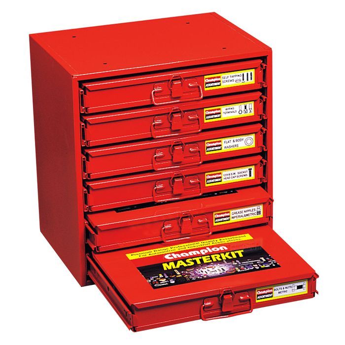 Description: Cabinet can be purchased empty or built with your selection of assortments, Sturdy metal cabinet complete with roll out trays, Attractively powder coated in red to complement the master kits, Dimensions: 390W x 300D x 415H (mm), Assortments are not included by default, Capacity: 6
