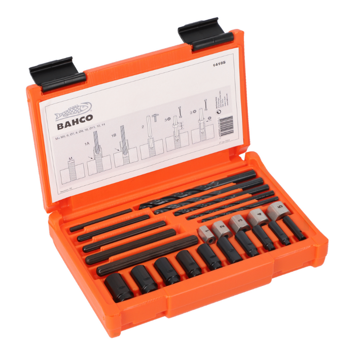 Description: For broken-off screws, bolts and studs. Includes guides, drill bits and extractors, High-performance alloy steel, Phosphate finish, Studs ranges from M5 to M16, Plastic case.
