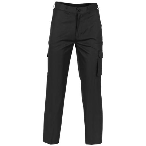 Description: 275 gsm 80% polyester, 20% viscose, Fabric treated with stain release, plain front, Two side pockets, one rear pocket. one side contains large flap cargo pocket, the other a mobile phone pocket.