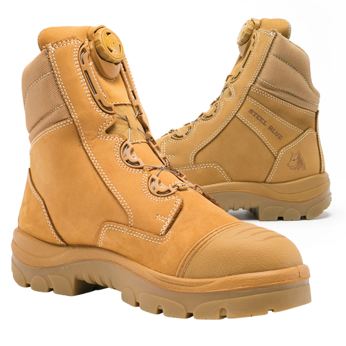 Description: 150mm high ankle boot with scalloped padded collar and tongue, Premium water resistant leather and stitched with Nylon thread, 200J safety steel toe cap, Abrasion resistant scuff cap for extra protection to the toe area, boot is lined with SpacerMesh® which are soft, non abrasive, hydrophobic material that wicks perspiration away from the foot, enabling the skin to remain cool and dry,Powered by the Boa Closure System, the Spin-FX boot is reinventing how work boots perform. Simply turning the dial will give you a perfect, comfortable fit. A simple pull of the dial immediately loosens your boots to be relaxingly kicked off at the end of a long day. No more loose or straggling shoelaces. Improved ankle support provides secure foot comfort increasing work safety & efficiency, A full length footbed that is inserted into the footwear to offer additional support and comfort. This footbed is made from soft polyurethane that will retain its shape and thickness throughout the life of the boot, Heavy-duty, flexible anti-bacterial non-woven insole, Directly moulded Polyurethane midsole for greater shock absorption, Antistatic Thermoplastic Polyurethane (TPU) outsole for superior wear properties. Heat resistant to 130ºC.