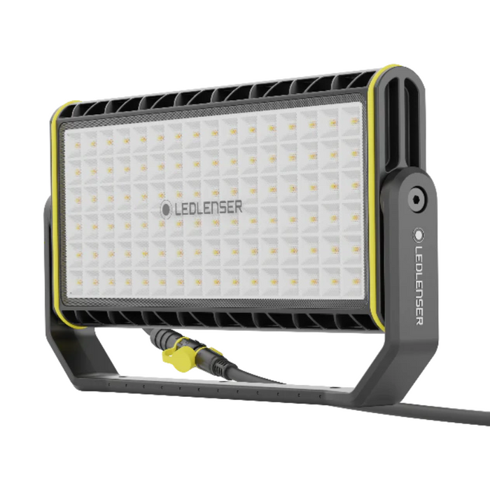 | MAINS-OPERATED MAXIMUM BRIGHTNESS Our powerful mains-operated floodlight easily provides continuous illumination of vast construction sites, tunnels and roads. The Ledlenser AF12C Work is an extremely bright and versatile companion for civil engineers, construction workers of all trades and even disaster relief teams. And: Despite its power, it is easy to handle. ENDLESS BENEFITS: Tunable White: Adjustable colour temperature for various applications, Reducable Peripheral Glare: Guarantees less glaring at work. The LEDs are embedded into a waffle structure and concentrate the light. At the same time, the reflector grid prevent peripheral glaring. Dimmable: Provide flicker free and constant light enabling optimal and safe illumination of fast moving parts or machines, Memory Function: Sets the light so that it starts in the last light mode or brightness level used when it is switched on, Temperature Control System: Keeps light from overheating so it can run brighter and longer, Multi-Concentrated Light: directs the light to where you need it the most. The highlight: It makes your light 12 % more energy efficient and the illuminance is 35 % higher than that of conventional floodlights. Cooling Technology: Allows for continuous operation without overheating. Transport Lock: Will not turn on accidentally and use up battery. 7 Year Warranty: Be confident that we stand behind the craftsmanship and quality of our products.