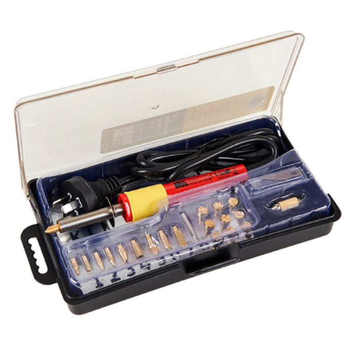 Ideal for: Soldering Circuit Boards, Arts & Crafts, Leather Stamping, Wood Burning, Electrical Wiring. Kit includes: 30W Wood Burning Unit, 10 x Wood Burning Tips, 9 x Wood Burning Stamps, Lettering Stencil, Soldering Tip, Knife & Collet.