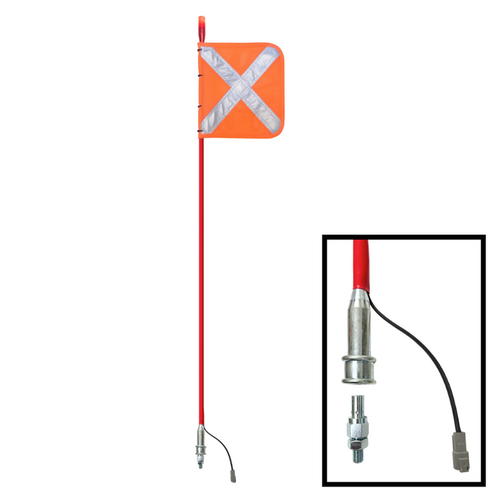 Description: 1.8M Top Red LED Whip 12V/24V with Female Deutsch Plug / Orange Reflective X Mesh Vehicle Safety Flag / Large Anti-Rotational Quick Release Base.