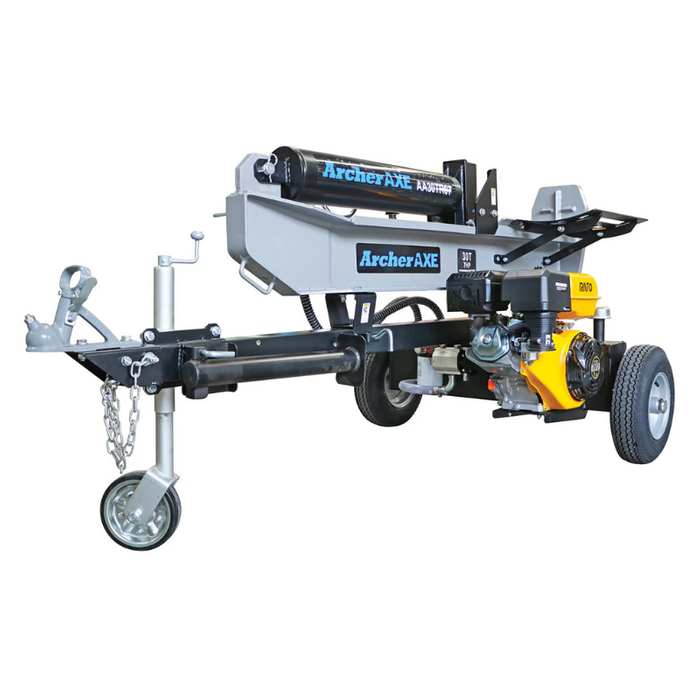 Description: Archer Axe - 30 ton vertical/horizontal log splitter fitted with a RATO R210 7hp engine. Maximum splitting force - 30 Tons, Engine - 7hp, 212cc RATO R210, Maximum log length - 25” (635mm), Cycle time, down & back - 12.2 seconds, Cylinder - 4-1/2” dia x 24” stroke, Pump, two stage - 15 GPM, Wedge, heat treated steel - 9” high, Beam - 9” foot plate, Hydraulic capacity - 22 litres max, Shipping weight - 240kg, Valve - Auto return with adjustable detent, Wheels - D.O.T. approved 16” O.D road tyres, Coupler - 2” ball with safety chains, Warranty - 1 Year, limited.