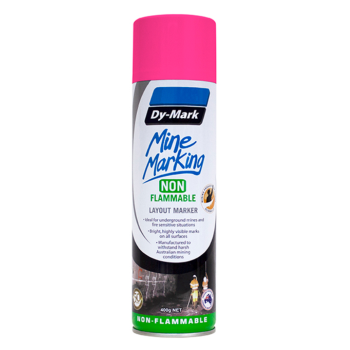 Description: Mine Marking Non-Flammable Marking Out Paint 400g | Non-flammable layout marker | Formulated for use in underground mines and other fire sensitive situations | 360º degree valve for any direction spray | Bright, highly visible marks on dark surfaces | Vertical spray is suitable for use with Dy-Mark’s Mine Marking Handle (5m extension)