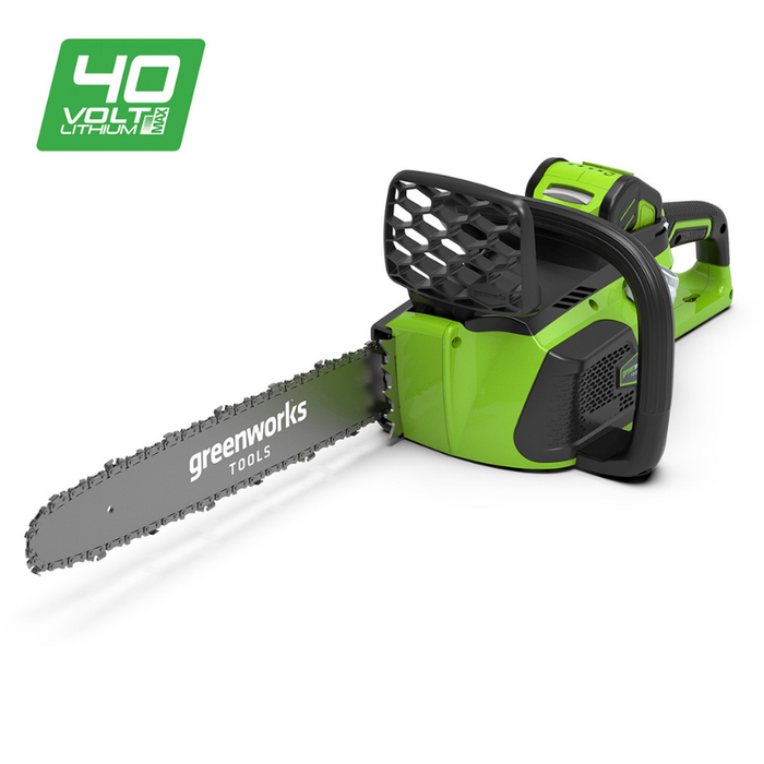 Description: 40V Chainsaw Brushless 40cm (15.7"). A practical, convenient and lightweight battery lithium-ion chainsaw. The GREENWORKS 40cm bar makes this outstanding chainsaw idyllic for chopping smaller trees along with pruning branches. The instant start switch contributes to fast and uncomplicated handling and the low noise levels lets you to work without disturbing your neighbours; perfect for residential areas. Thanks to its brushless motor the tool will deliver up to 30 percent more power. A two-button safety operation ensures you avoid any accidental start-up.