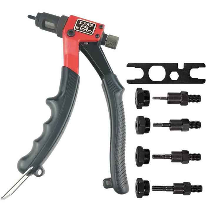 Rivet Nut Gun Kit is applicable for M3, M4, M5, M6, very practical and convenient to use. Adopts manual rotation back device, Rivet Nut Gun Kit can help you to save time and effort, quick and convenient. With ergonomic handle design, Rivet Nut Gun Kit is comfortable to hold and won't skid when operate even for a long time. Rivet Nut Gun Kit comes with thickening high carbon steel handle, with energy saving design of bending helve; Adopt high temperature treatments for spear parts, practical. Model: BT-603; Maximum Effective Working Stroke: Approx. 6mm / 0.2in; Maximum Force Arm Multiple: 25 Times; Length: Approx. 210mm / 8.3in.