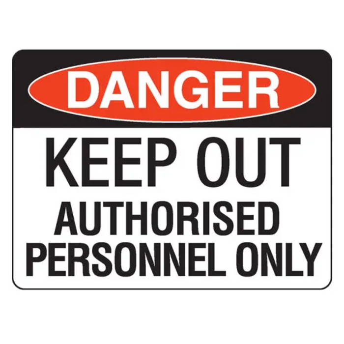 Description: Use this Danger Keep Out Authorised Personnel Only Sign to warn you are to keep out of this area unless you are authorised to do so. Danger signs are safety signs for warning of a particular hazard or hazardous condition that is likely to be life-threatening. Danger safety signage has many uses and can warn of many dangerous situations – such as fuel storage, radiation, high voltage, chemicals, open holes, and worksite hazards. The sign is shown as the word Danger on a red oval over a black rectangle. Text is black on a white background.
