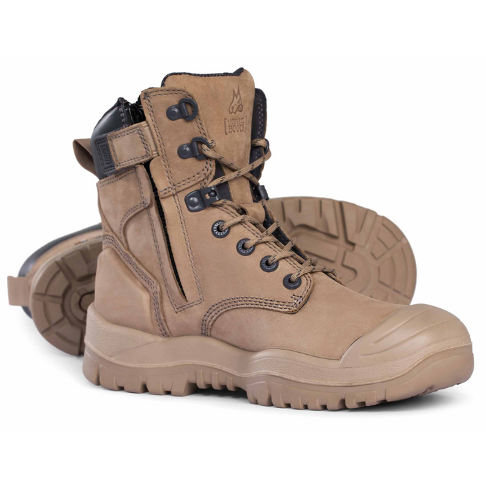 DESCRIPTION: 200J steel toe cap, Heat, oil & acid resistant Vibram® rubber outsole, Moulded PU scuff cap for longevity, YKK zipper w/ full length ZipGuard, Antistatic, SRC slip resistance, AirZone Comfort System®, OrthoTec Poron® footbed w/ anatomical arch support, Dri-Freeze® lining that dissipates heat, Nomex® vamp stitching, Silicone AbrasionGuard, Padded tongue and collar, Premium full grain leather.
