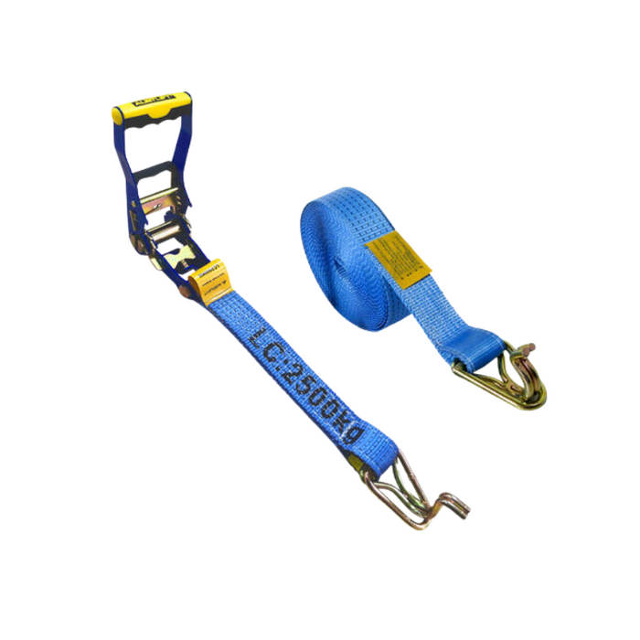 Description: Ratchet Tie Down Hk/keeper 50mm x 9M x LC2500kg Swiftcore 'Plastic' ergonomic Handle. Ratchet tie down assembly Steel Handle with Swiftcore, Herrinebone protective sleeve, reflective lines and Flip 'N' Stick tie up strip. Hook & Keep - Plastic moulded handle