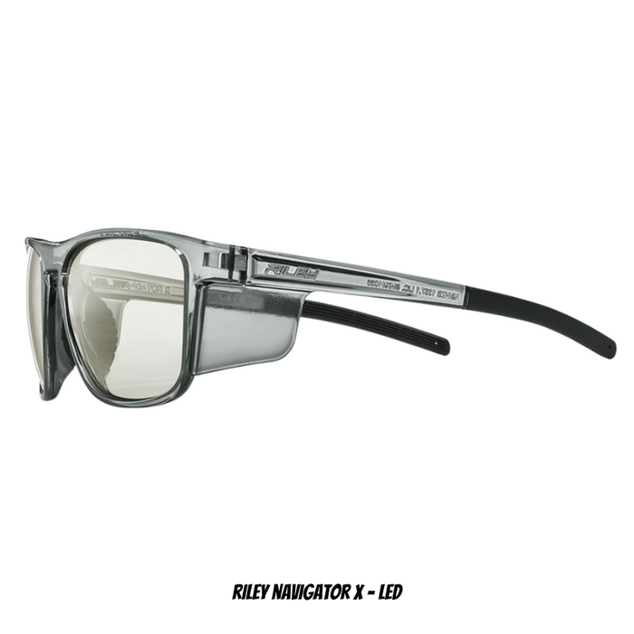 Key Features: Riley Navigator X. Avail in various lens styles; Grey/LED/Polarised/HD Lens/Artic Blue Revo/ Emerald Revo/Clear. Pushing the boundaries on style and innovation, the new Navigator X offers a protective eyewear solution without compromise. Featuring the iconic wayfarer design, high quality materials and specialist lens options, the Navigator X is the next level for style and safety.