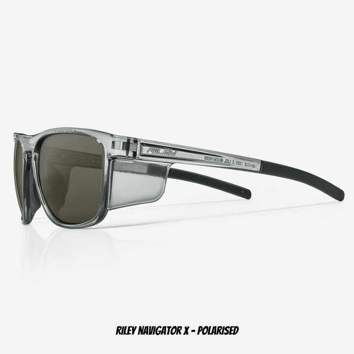Key Features: Riley Navigator X. Avail in various lens styles; Grey/LED/Polarised/HD Lens/Artic Blue Revo/ Emerald Revo/Clear. Pushing the boundaries on style and innovation, the new Navigator X offers a protective eyewear solution without compromise. Featuring the iconic wayfarer design, high quality materials and specialist lens options, the Navigator X is the next level for style and safety.