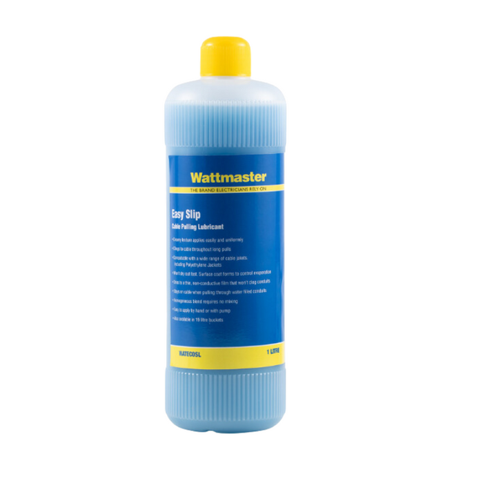 Description: Cable Pulling Lubricant Econoslide Blue 1 Litre Bottle. Low cost and economical Easy to use and clean up; non-staining. High performance, slow-drying, water based lubricant. Compatible with a wide range of cable jacket materials. Good friction reducing properties. Non–toxic; washes off with water. Available in 1 litre bottle