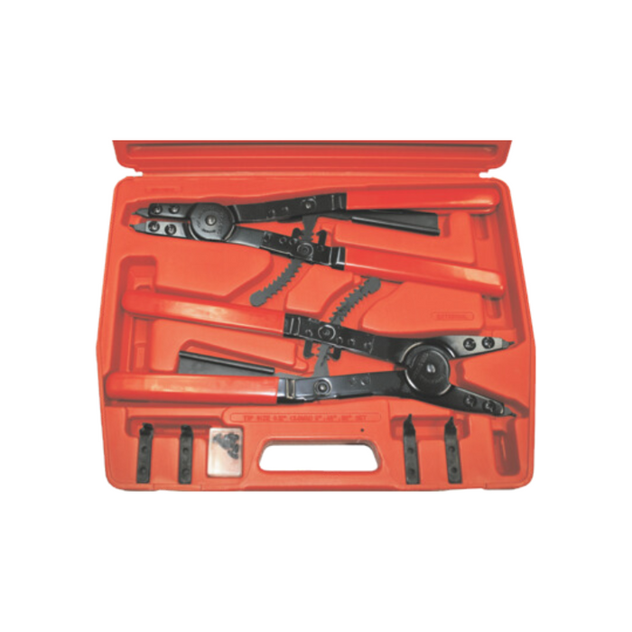 DESCRIPTION: Extra heavy-duty internal and external circlip pliers, with replaceable points and spring ratchet locking mechanism to securely hold against circlip tension. Supplied in blow mold case. Contains six pairs of interchangeable tips (both internal & external) in Straight, 45° and 90° with .120"(3mm) tip diameters. Length: 16" (400mm). Spread: 3.3/8" (85mm).