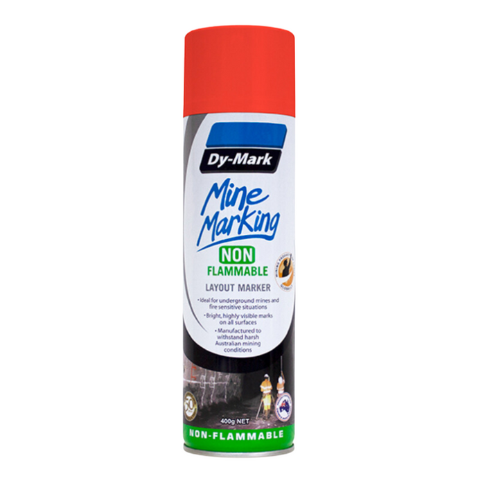 Description: Mine Marking Non-Flammable Marking Out Paint 400g | Non-flammable layout marker | Formulated for use in underground mines and other fire sensitive situations | 360º degree valve for any direction spray | Bright, highly visible marks on dark surfaces | Vertical spray is suitable for use with Dy-Mark’s Mine Marking Handle (5m extension)