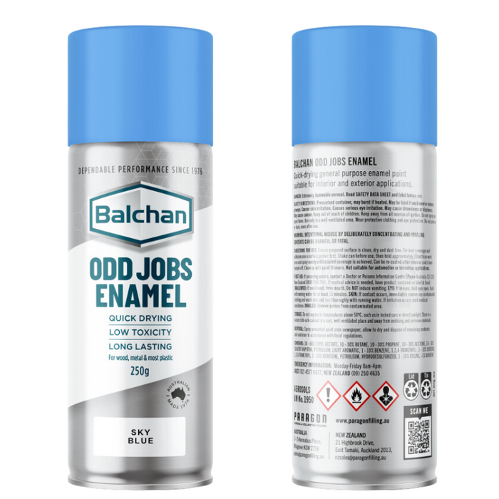 DESCRIPTION: Balchan Odd Jobs Professional Touch-Up Paint is a fast-drying, enamel spray paint that comes in a handy 250g aerosol can with a colour coded lid. Ideal for touch-up jobs around the home or on-site. It comes in a handy 250g aerosol can and is suitable for many applications, including cupboards, doors, gates, iron, letterboxes, and toys. Not recommended for automotive use this paint is compatible with most other paints, however check for compatibility on a small area when painting over previously painted surfaces. Avail in various colours. Key benefits of using Balchan Odd Jobs are – Quick Drying | Low Toxicity | Long Lasting | Interior / Exterior | Made in Australia