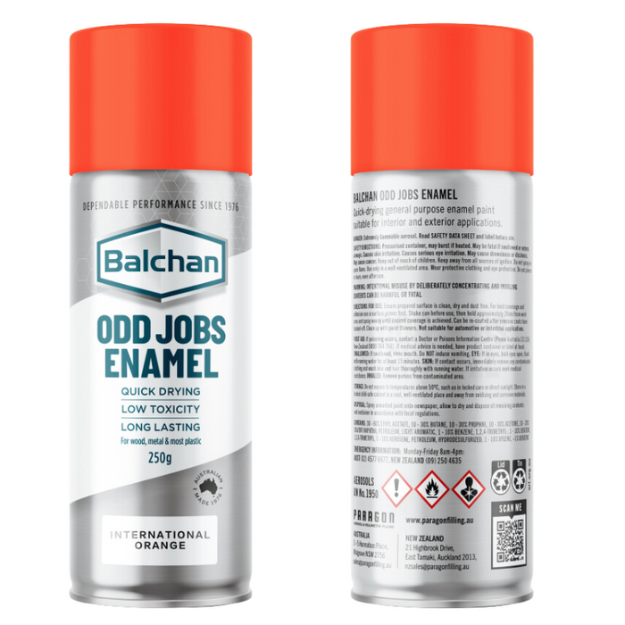 DESCRIPTION: Balchan Odd Jobs Professional Touch-Up Paint is a fast-drying, enamel spray paint that comes in a handy 250g aerosol can with a colour coded lid. Ideal for touch-up jobs around the home or on-site. It comes in a handy 250g aerosol can and is suitable for many applications, including cupboards, doors, gates, iron, letterboxes, and toys. Not recommended for automotive use this paint is compatible with most other paints, however check for compatibility on a small area when painting over previously painted surfaces. Avail in various colours. Key benefits of using Balchan Odd Jobs are – Quick Drying | Low Toxicity | Long Lasting | Interior / Exterior | Made in Australia