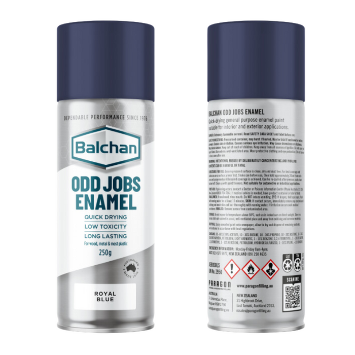 DESCRIPTION: Balchan Odd Jobs Professional Touch-Up Paint is a fast-drying, enamel spray paint that comes in a handy 250g aerosol can with a colour coded lid. Ideal for touch-up jobs around the home or on-site. It comes in a handy 250g aerosol can and is suitable for many applications, including cupboards, doors, gates, iron, letterboxes, and toys. Not recommended for automotive use this paint is compatible with most other paints, however check for compatibility on a small area when painting over previously painted surfaces. Avail in various colours. Key benefits of using Balchan Odd Jobs are – Quick Drying | Low Toxicity | Long Lasting | Interior / Exterior | Made in Australia