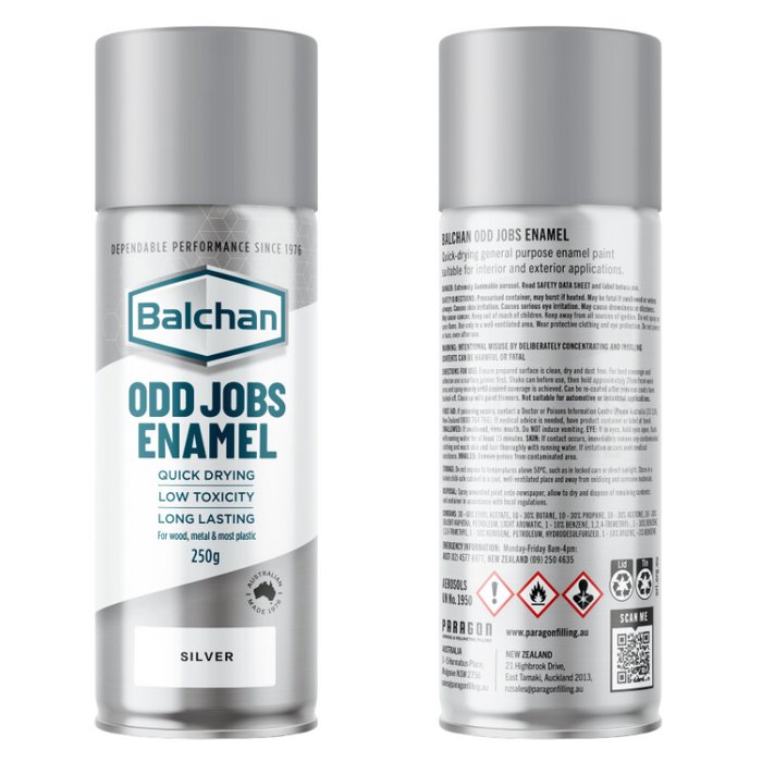 DESCRIPTION: Balchan Odd Jobs Professional Touch-Up Paint is a fast-drying, enamel spray paint that comes in a handy 250g aerosol can with a colour coded lid. Ideal for touch-up jobs around the home or on-site. It comes in a handy 250g aerosol can and is suitable for many applications, including cupboards, doors, gates, iron, letterboxes, and toys. Avail in various colours. Key benefits of using Balchan Odd Jobs are – Quick Drying | Low Toxicity | Long Lasting | Interior / Exterior | Made in Australia