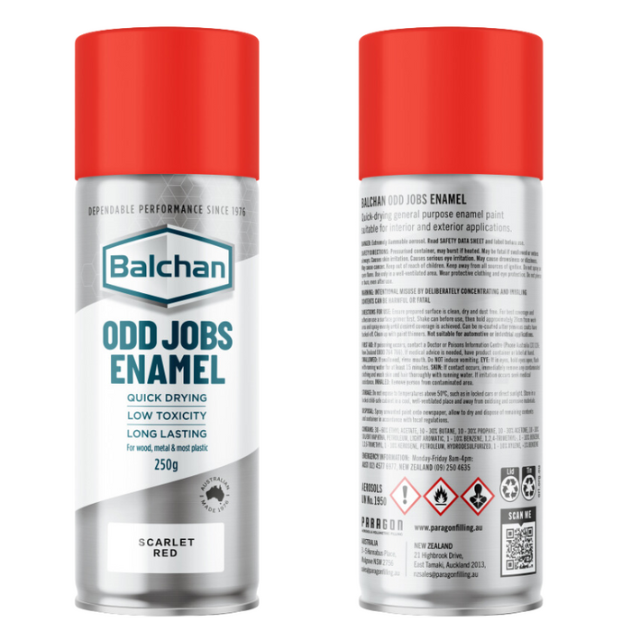 DESCRIPTION: Balchan Odd Jobs Professional Touch-Up Paint is a fast-drying, enamel spray paint that comes in a handy 250g aerosol can with a colour coded lid. Ideal for touch-up jobs around the home or on-site. It comes in a handy 250g aerosol can and is suitable for many applications, including cupboards, doors, gates, iron, letterboxes, and toys. Avail in various colours. Key benefits of using Balchan Odd Jobs are – Quick Drying | Low Toxicity | Long Lasting | Interior / Exterior | Made in Australia