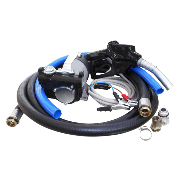 DESCRIPTION: Electric Diesel Pump Kit - 85LPM. TECHNICAL SPECIFICATIONS: Suitable for Diesel use only. Flow rate up to 85LPM. Inlet/Outlet: 1" BSP(F). 30 minute duty cycle. Maximum suction lift 2m. Automatic nozzle. Includes 12V pump unit with 4m power cord, alligator clips, fuse holder, built-in strainer, 25mm x 4m delivery hose, 25mm x 2m suction hose and hose fittings