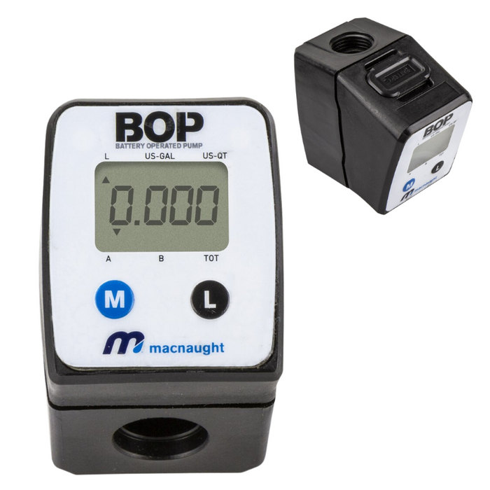 DESCRIPTION: BOP (Battery Operated Pump) Inline Meter | BOP Inline electronic meter suitable for use with BOP dispense gun. TECHNICAL SPECIFICATIONS: Flow Range; up to 10l/m | Operating Temp; -20?C to 70?C | Operating Pressure; 20psi (MAX 60psi) | Accuracy +/- 2% of Reading | IP Rating; IP65 | Inlet; 1/2" BSP connector supplied | Outlet; 1/2" BSPF | Power; 1 x CR2450 - 3v Li coin batt PACKAGE INCLUDES: BOP Inline Meter + Fittings + Battery + Quick Start Guide