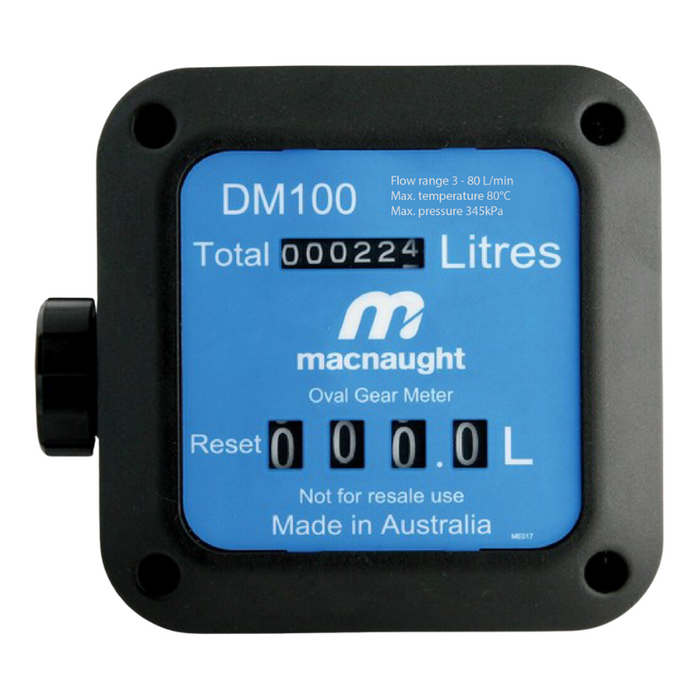 DESCRIPTION: Oval gear mechanical fuel meter. Flow rate 3 - 80 L/min. Accurate reading to +/-1 %. Operating pressure up to 345 kPa (50 psi). Resettable totaliser 999.9 litres. Suitable for diesel, kerosene, petrol and oils. Best choice for gravity feed tanks and unit has 1" BSP(F) ports. TECHNICAL SPECIFICATIONS: Flow range between 3 - 80L/min | Operating pressure up to 345 kPa (50 psi) | Accuracy around +/- 1.0% of reading | Fitted with 1" BSP(F) inlet/outlet | Mechanical display with push-button reset batch total [REPAIR KITS: DM100-1K: Seal Kit]