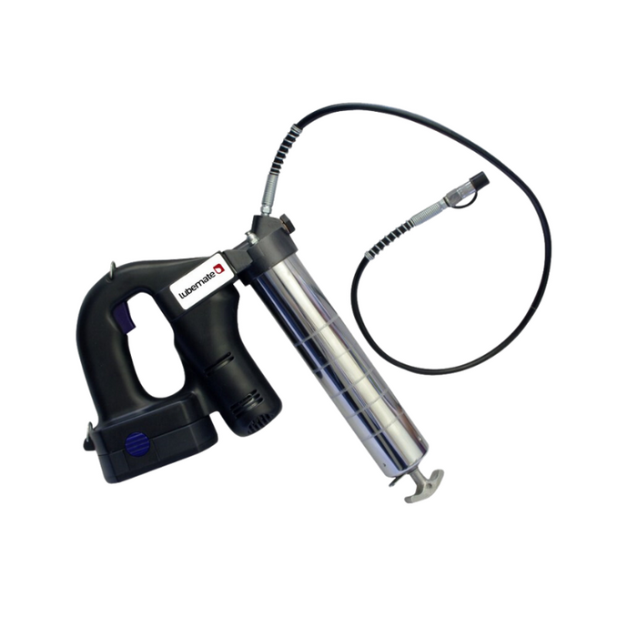 DESCRIPTION: The L-BG18VLi is a heavy duty, continuous flow, battery operated grease gun. Supplied complete with carry case, 2 x Li-ion batteries, battery charger, meter long extension with coupler, delivers flow rates up to 50g/min with pressures up to 7,500psi. The L-BG18VLi grease gun provides the operator with the means to efficiently reduce greasing times which is normally associated with manual grease guns. The continuous flow and instant pressure is achieved with minimal physical effort. The L-BG18VLi is the ideal tool for the quick reliable greasing of your equipment. The shoulder strap provided help prevent operator fatigue. The extra battery included will ensure you always have a fully charged battery on hand. When using the L-BG18VLi, the time taken to grease your equipment will now be considerably reduced. TECHNICAL SPECIFICATIONS: 240V Charger (1 Hour charge time) | 2 x 18 Volt Li-ion batteries | Develops 51,700 kPa (7,500 psi) | Delivers 50g/min free flow | 1m high pressure flexible grease extension | 4 jaw grease coupler | 450g cartridge or bulk fill | Up to NLGI 2 | Weight 6.6kg | No spare parts available PACKACGE INCLUDES: 18v Battery operated grease gun + 1m Long high pressure flexible grease extension + 4 jaw grease coupler + 2x 18v Li-ion batteries + Battery charger + Shoulder strap + Carry case