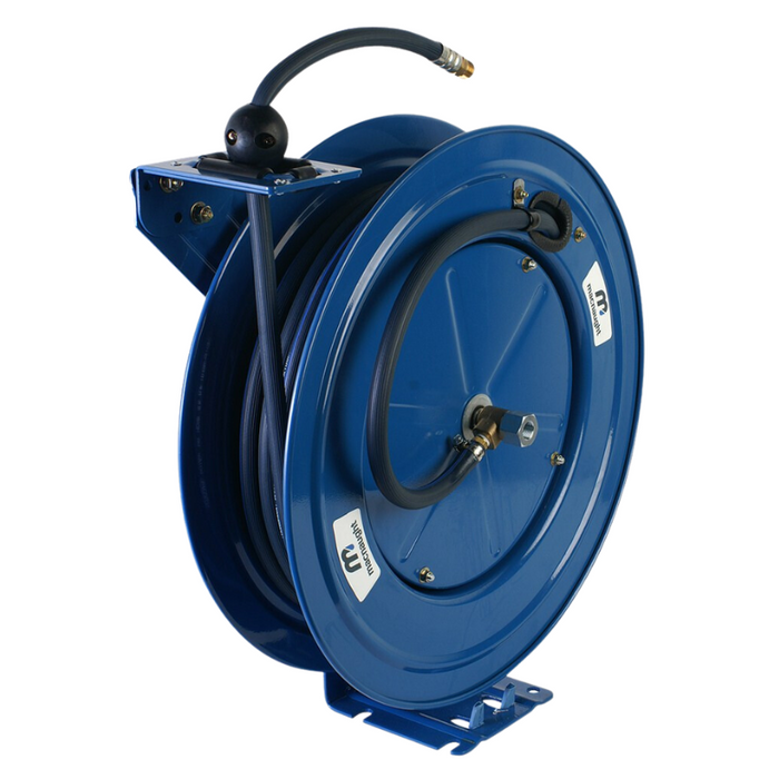 DESCRIPTION: Oil reel - spring-rewind, suits longer hose demands in medium/large workshops. TECHNICAL SPECIFICATIONS: Fitted with 20m x 12.5mm i.d. SAE100R1 rubber hose | Operating pressure up to 2000 PSI / 13,800 kPa | 1/2" BSP (F) reel inlet and 1/2" BSP (M) hose outlet | Wall / floor mounting bracket integral to the reel design